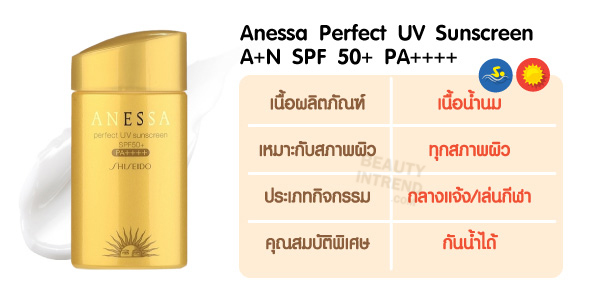 ครีมกันแดดทาหน้าจากแบรนด์ Shiseido มีให้เลือกหลายสูตรตามสภาพผิวของสาวๆ แต่ที่ฮิตที่สุด คงจะเป็นรุ่น Anessa Perfect UV Sunscreen A+N SPF 50+ PA++++ ไม่ว่าจะเป็นกิจกรรมในร่ม หรือกลางแจ้ง ก็ไม่มีปัญหาเอาอยู่ และที่สำคัญเป็น Waterproof ที่ล้างออกได้ง่าย เนื้อครีมเป็นเนื้อน้ำนม ให้สัมผัสที่เนียนลื่น ไม่เหนียวเหนอะหนะ ไม่ทิ้งคราบขาว