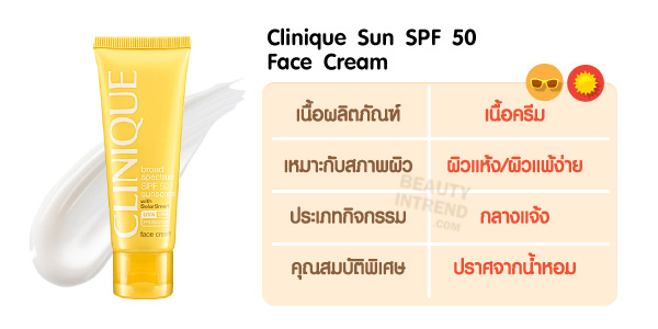 ครีมกันแดดทาหน้ายี่ห้อ Clinique ตัวนี้เหมาะกับผิวที่แพ้ง่าย สามารถป้องกันแดดได้ครบทั้ง UVA,UVB มีสารแอนติออกซิแดนท์หลายชนิด ไม่มีน้ำหอม และกันน้ำกันเหงื่อได้ดีอีกด้วย